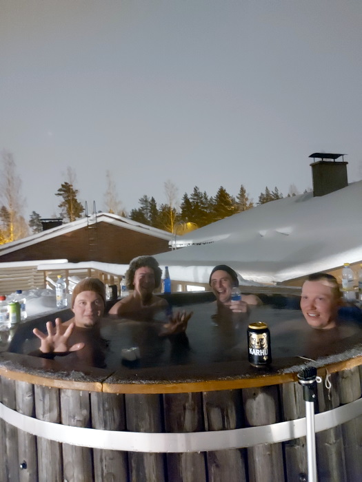 Eipä aikaakaan, kun ukot olivat saapuneet alppimajan uumeniin ja oli aika aloittaa palautuminen. Miehistö tankkasi hiilihydraattipitoista ruokaa ja nautti elektrolyyttijuomia, jotta tänä vuonna polttoaine ei pääsisi loppumaan turnauksen ratkaisevilla hetkillä, kuten niin monena vuonna aikaisemmin oli valitettavasti päässyt käymään. Ilta alkoi totutun seesteisissä merkeissä. Kuulumisia vaihdettiin sivistyneesti ja taidettiinpa siinä lomassa, jotain urheilua tuijottaa taikaruudustakin, kunnes Hakki pudotti hieman takellellen ilmoille yllätyksen. Mies vaati ehdotonta hiljaisuutta ja pian porukka pysähtyikin kuuntelemaan mitä miehellä oli sanottavanaan. Paljon en siitä puheesta enää muista, joten tiivistetäänpä tähän ne tärkeimmät: Biisi, Teemu koulusta ja murtumaton.